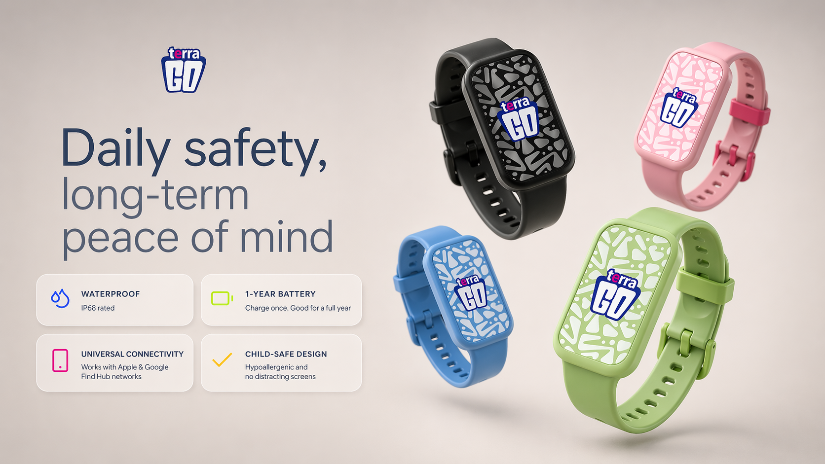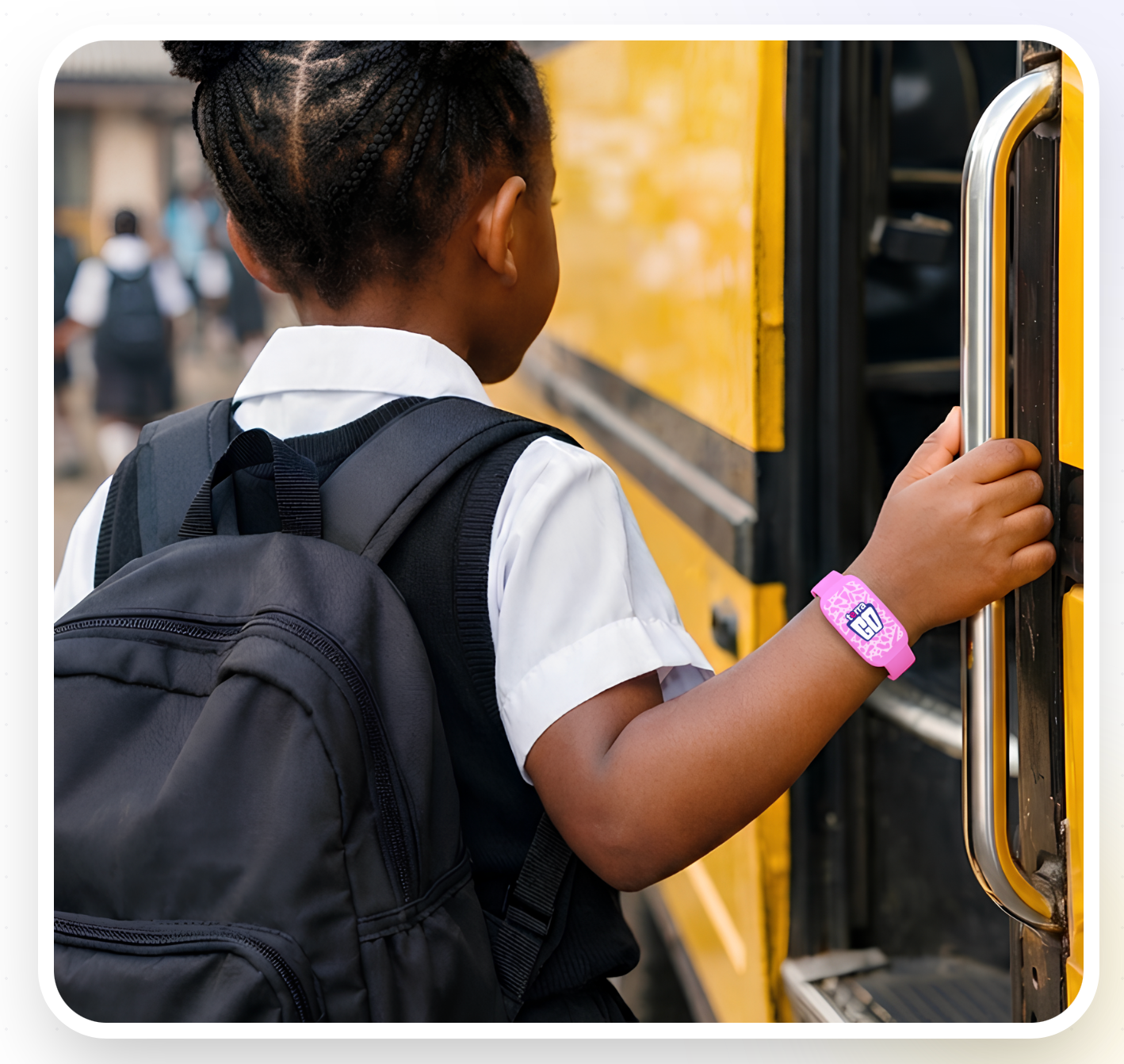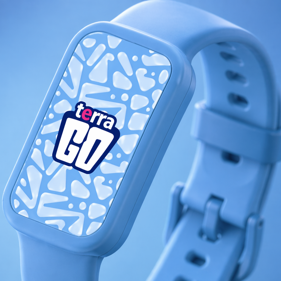 The Terra GO Band is a lightweight, durable wristband designed for kids that connects to the Terra GO platform, keeping parents informed at every key moment of the school day, from morning pickup to arrival at school and back home safely.